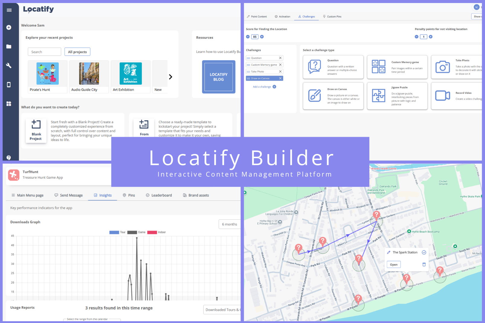 The Locatify Builder powering TurfHunt provides visual, no-code tools for designing sophisticated experiences: