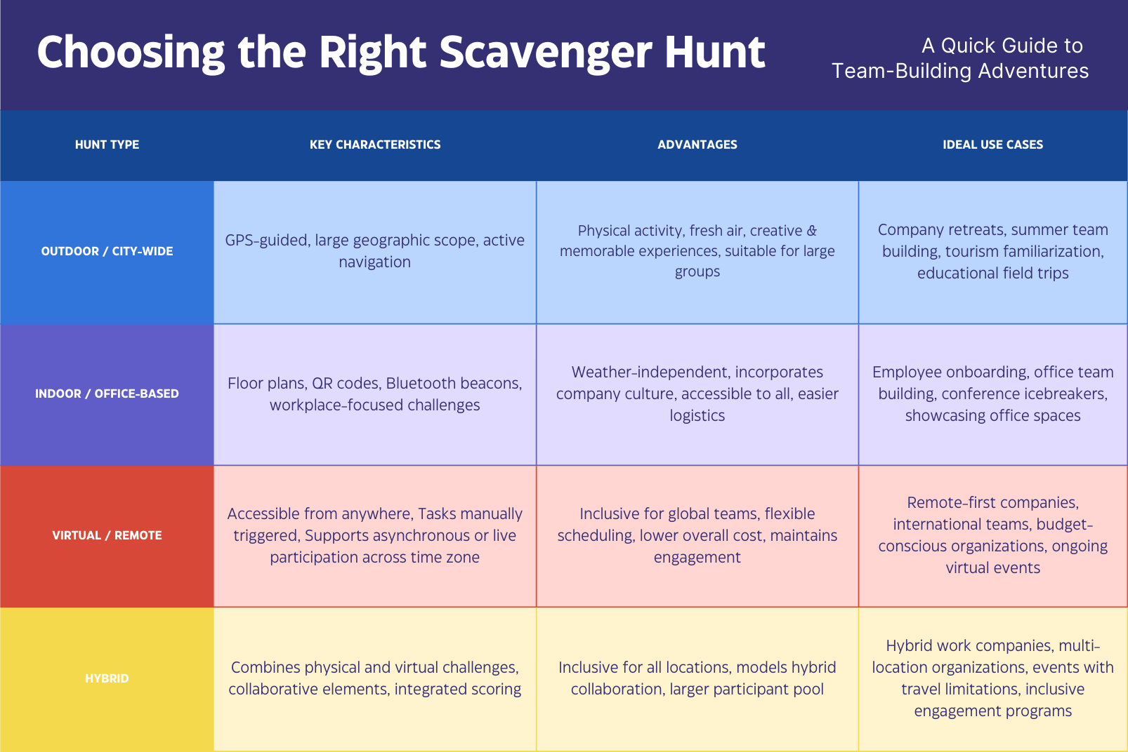 The versatility of scavenger hunts as a team building format allows adaptation to virtually any context, objective, or constraint. Understanding different implementation models helps organizations select approaches aligned with their specific needs.